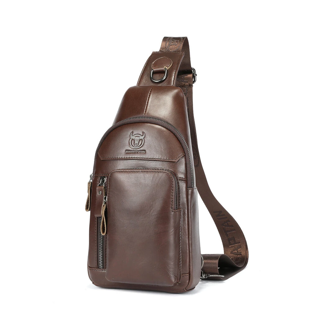BULLCAPTAIN 8-Inch Men’s Chest Bag Top-grain Cowhide Leather Vintage Multi-Pocket Shoulder Messenger Bag for Outdoor Daily Travel