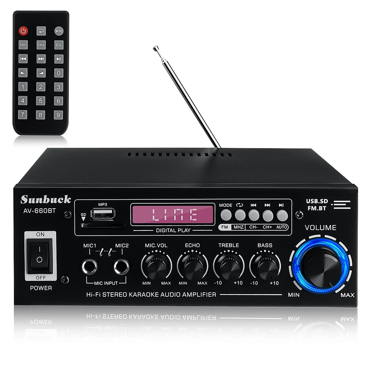 Sunbuck AV 660BT 2000W bluetooth 5.0 Audio Power Amplifier EQ Stereo AMP Car Home 2CH AUX USB FM Radio